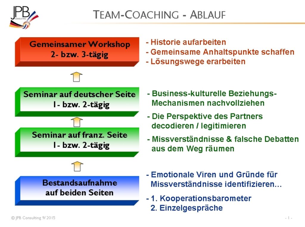 Anhand dieser Diagnose können anschließend im Rahmen des deutsch-französischen Coachings die Gründe für Missverständnisse und Frustrationen, aufgebaute Historie und weitere „emotionale Viren“ legitimiert werden. - Schritte eines Team-Coaching Prozesses: Bestandsaufnahme der Wahrnehmungen, getrennte Seminare und gemeinsamer Workshop