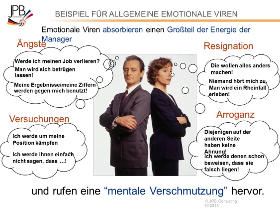 Diese hochgradig ansteckenden negativen Emotionen, die JPB als „emotionale Viren“ bezeichnet, treten an hochsensiblen Punkten der Zusammenarbeit auf, wie Machtaufteilung, Identitätsverlust, Orientierungslosigkeit, Konfrontation mit dem „Not-invented-here“-Syndrom usw.