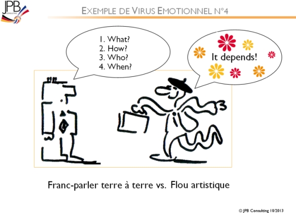 Ces émotions négatives au fort potentiel de contagion, que JPB Consulting appelle « virus émotionnels », sont liées aux points sensibles de la coopération, tels que la répartition du pouvoir et des ressources, les pertes de référentiels et d’identité, la confrontation avec le « not invented here », etc.
